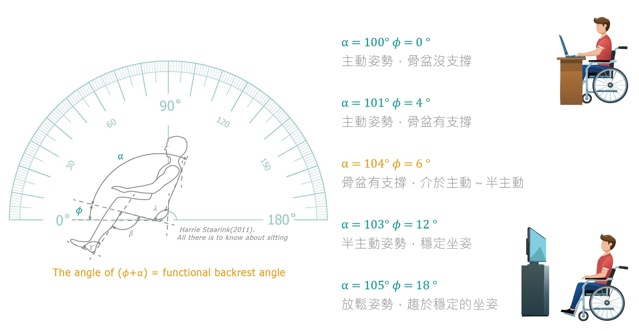 《All there is to know about sitting》(Harrie Staarink. 2011),⍺ + 𝜙功能性背靠角度對輪椅使用者的影響 。