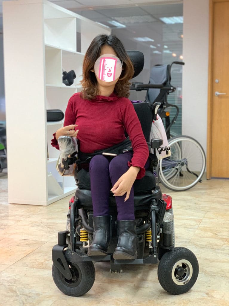 現況:肌萎患者 C小姐,目前使用電動輪椅,上半身為了操作右手控制器,向右側彎變形,平時側躺入睡。